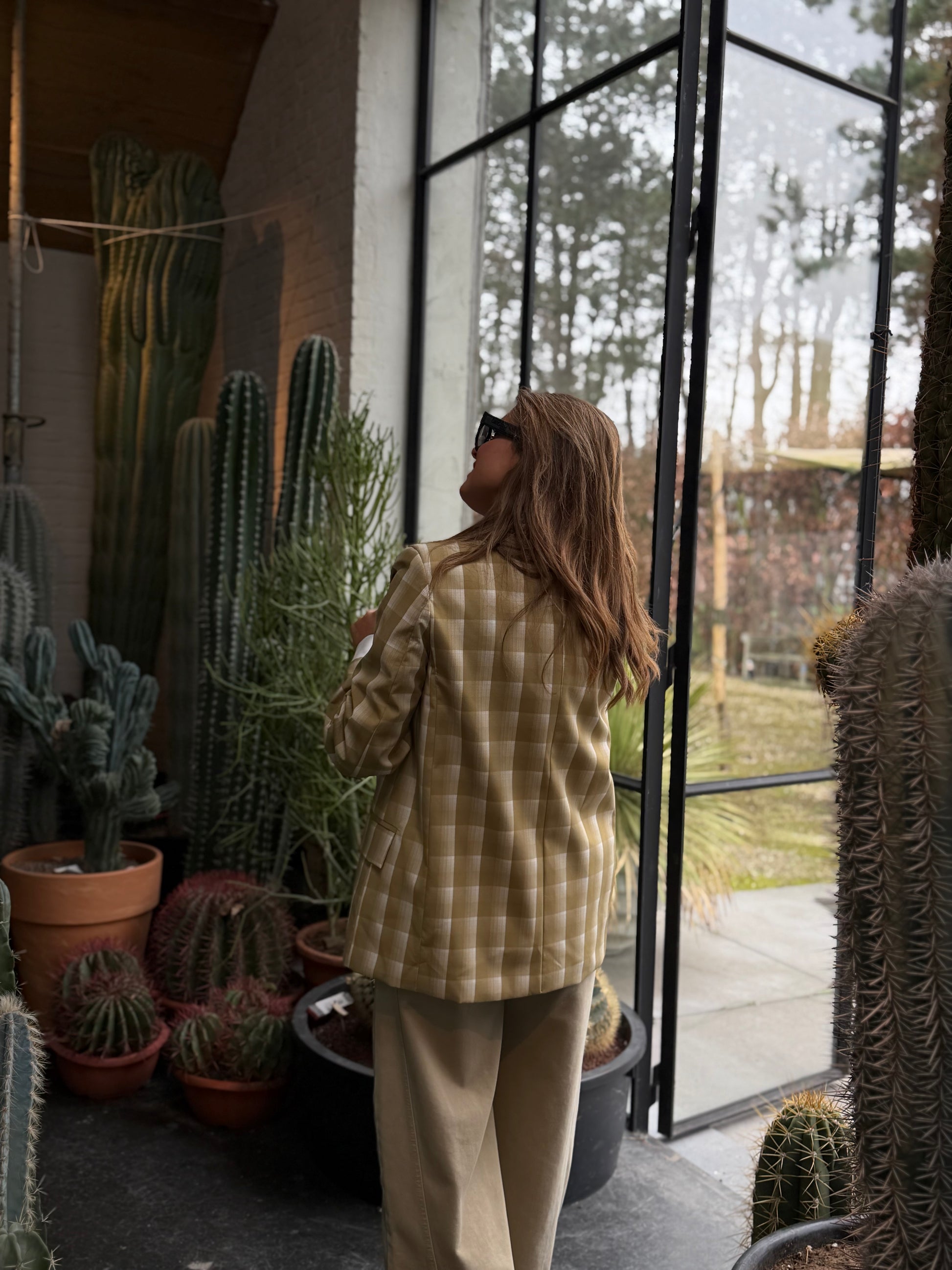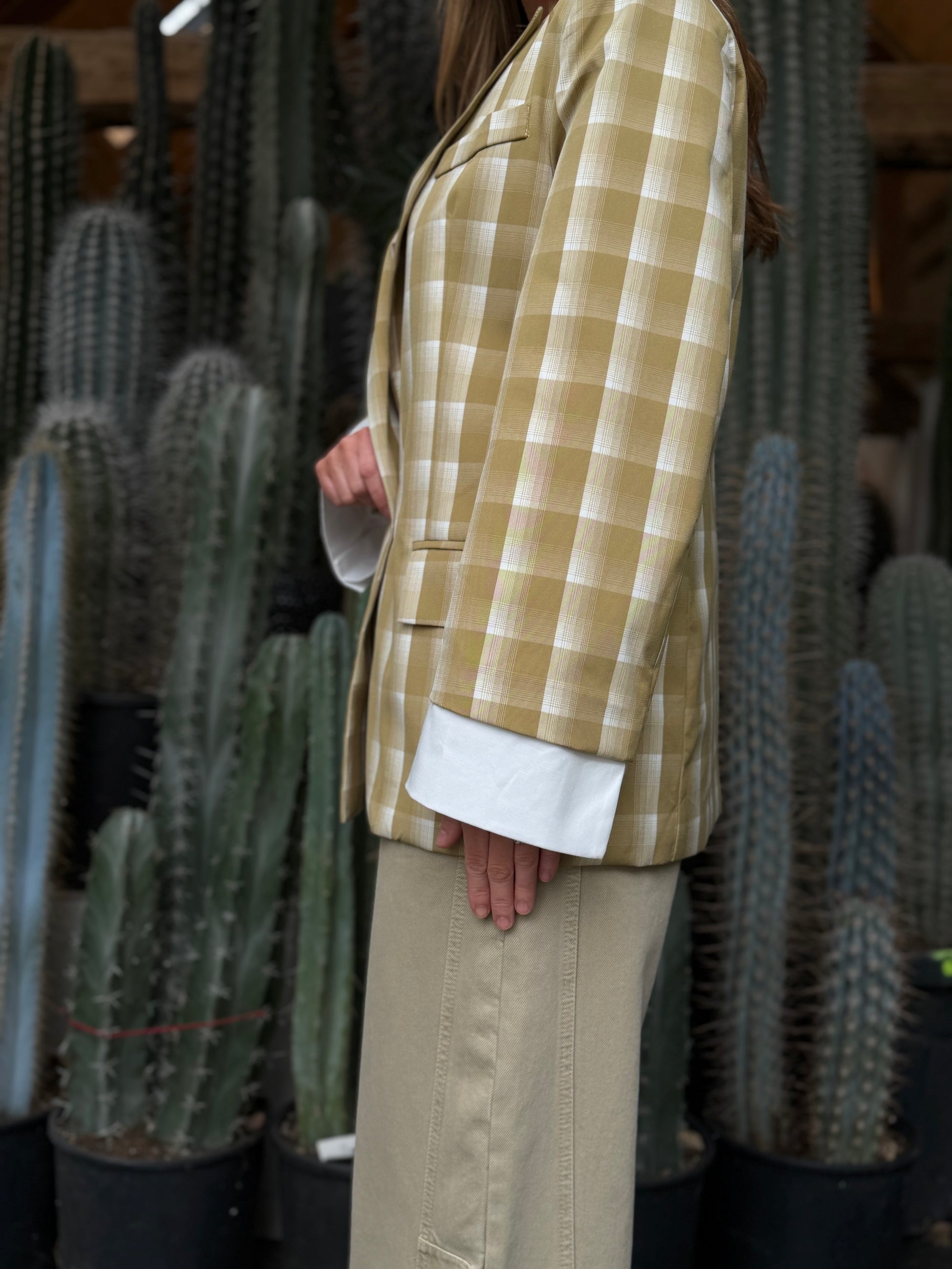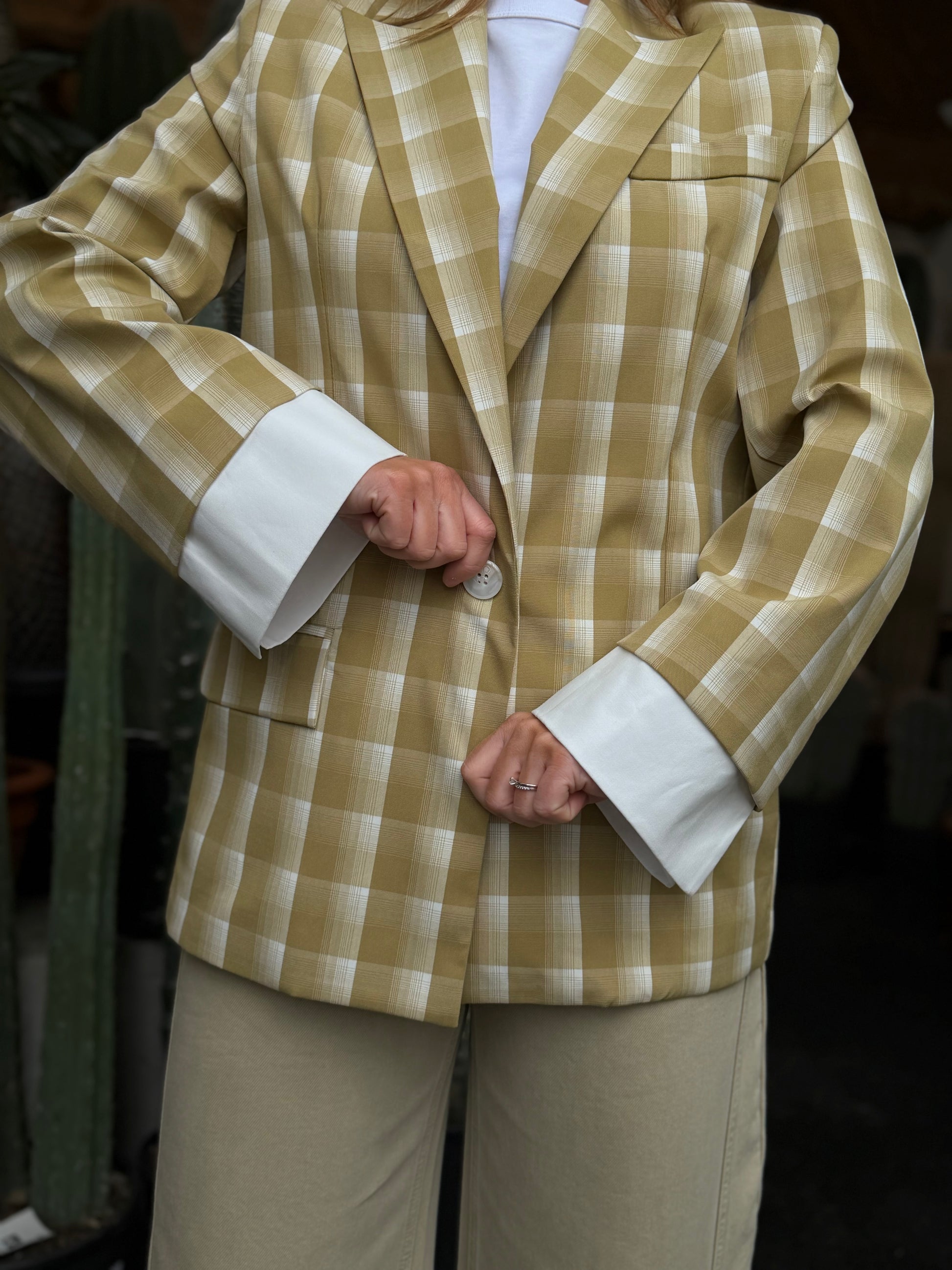Stijlvolle geruite blazer in een elegante kaki kleur. De tijdloze ruitprint en comfortabele pasvorm maken dit item perfect voor zowel een casual als geklede look. Een veelzijdige blazer die moeiteloos te combineren is met elke outfit.