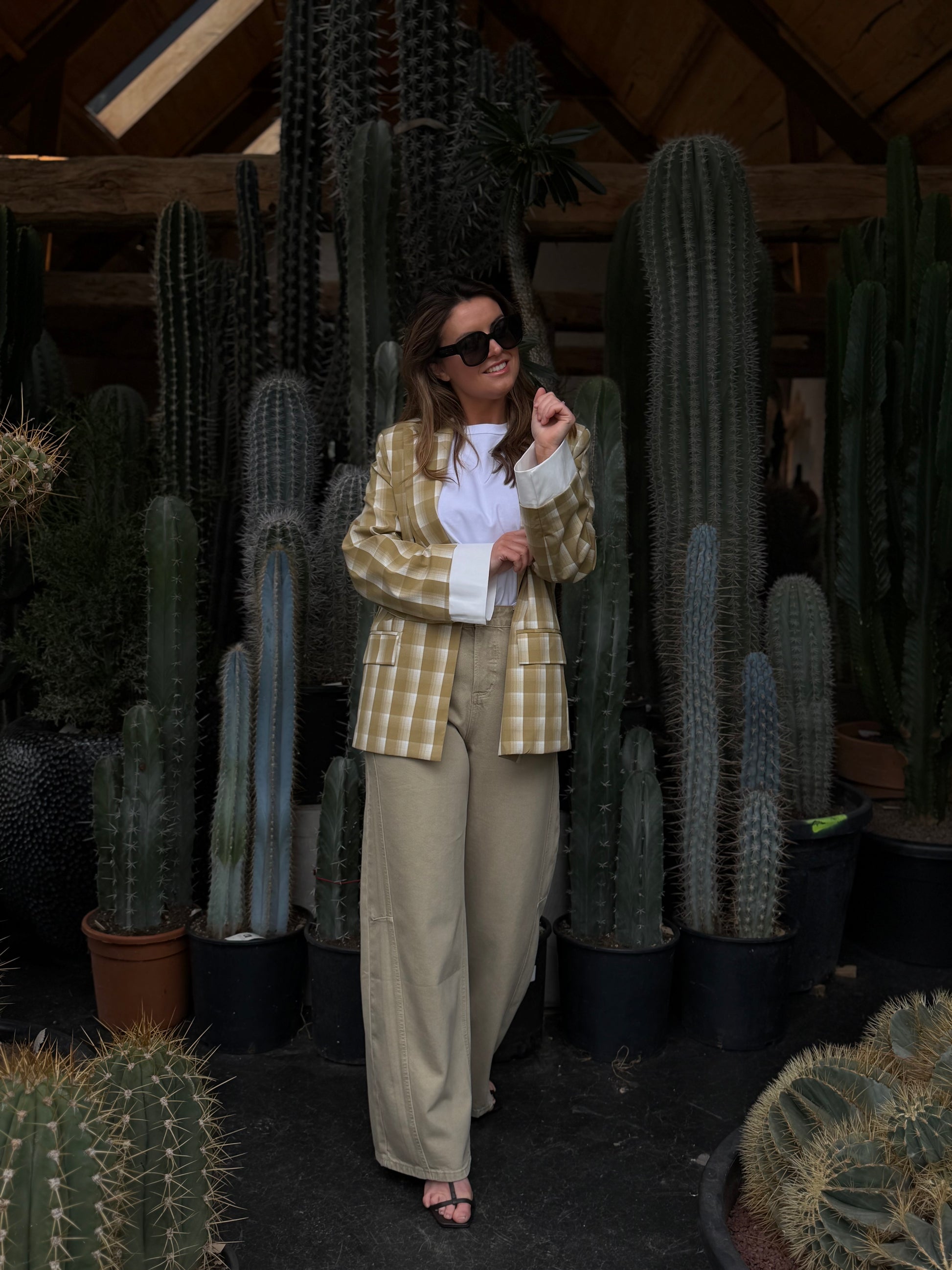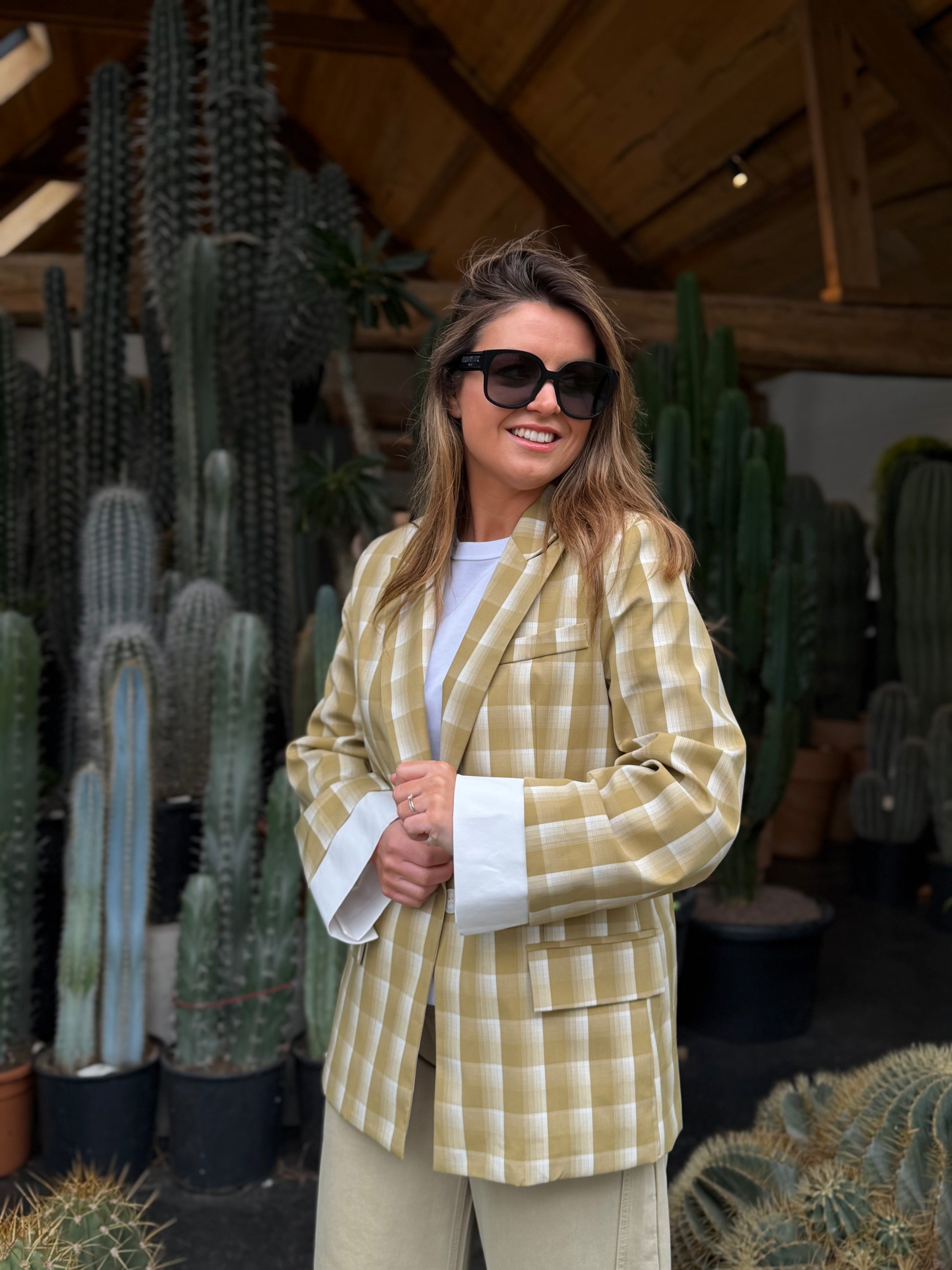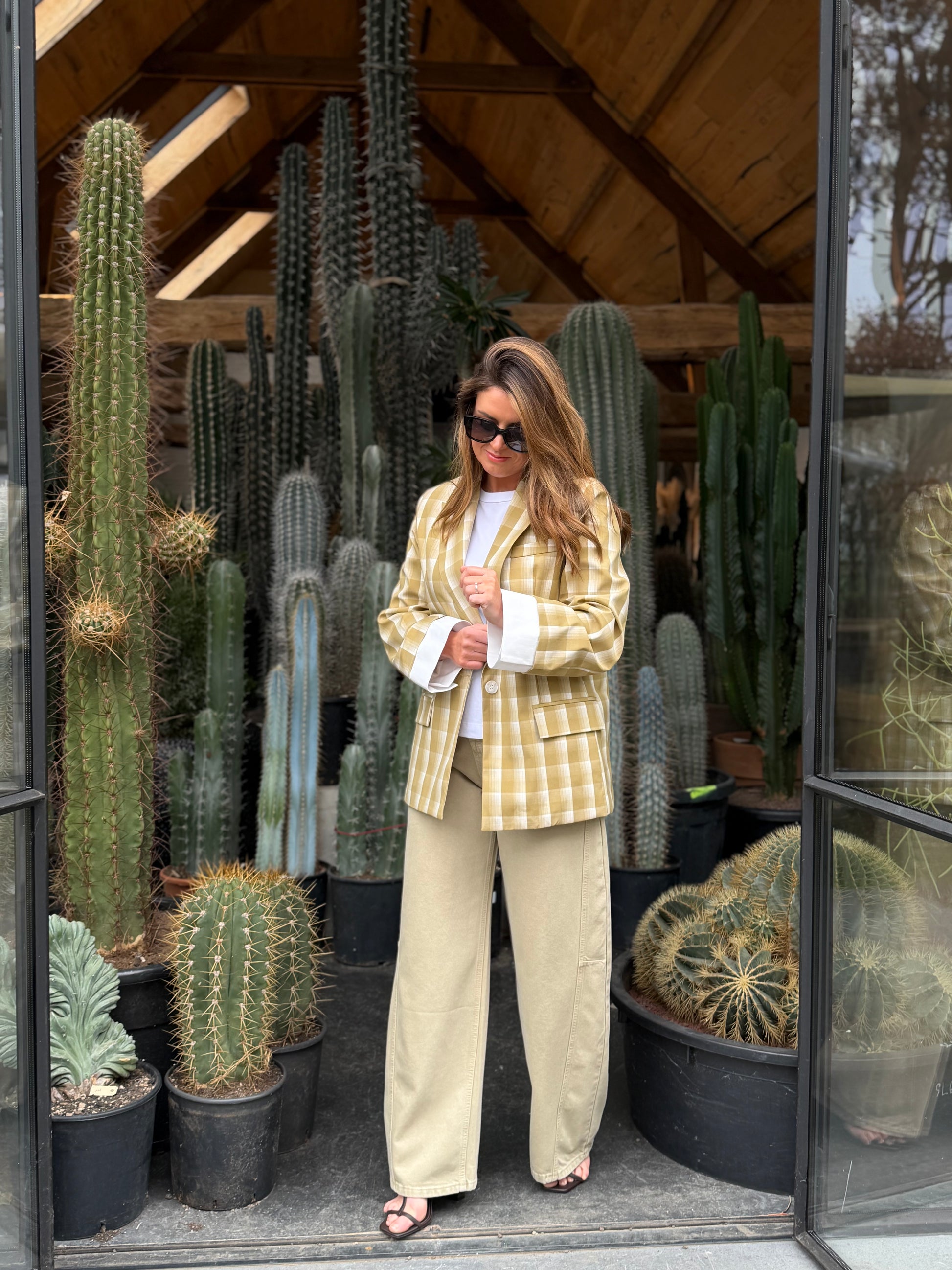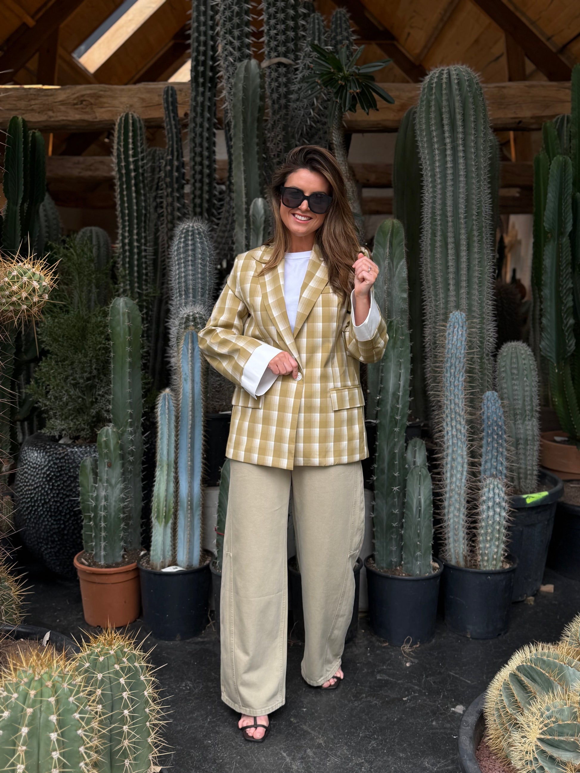 Stijlvolle geruite blazer in een elegante kaki kleur. De tijdloze ruitprint en comfortabele pasvorm maken dit item perfect voor zowel een casual als geklede look. Een veelzijdige blazer die moeiteloos te combineren is met elke outfit.