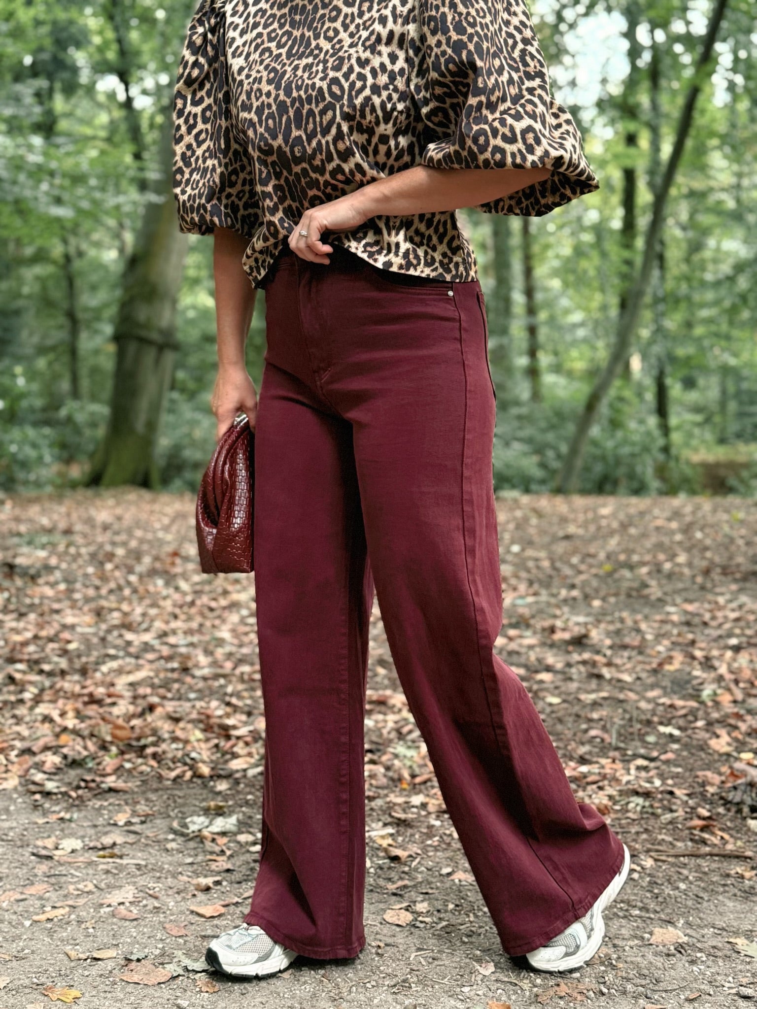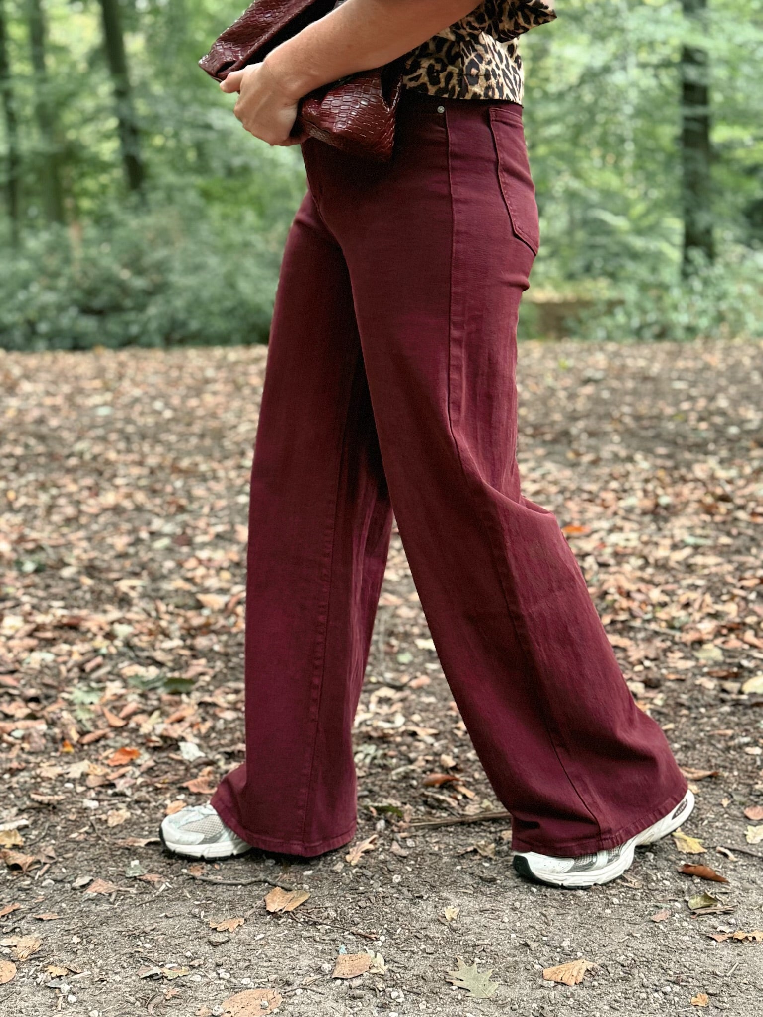 Ontdek het nieuwe model: de bordeaux jeansbroek die je garderobe nodig heeft.