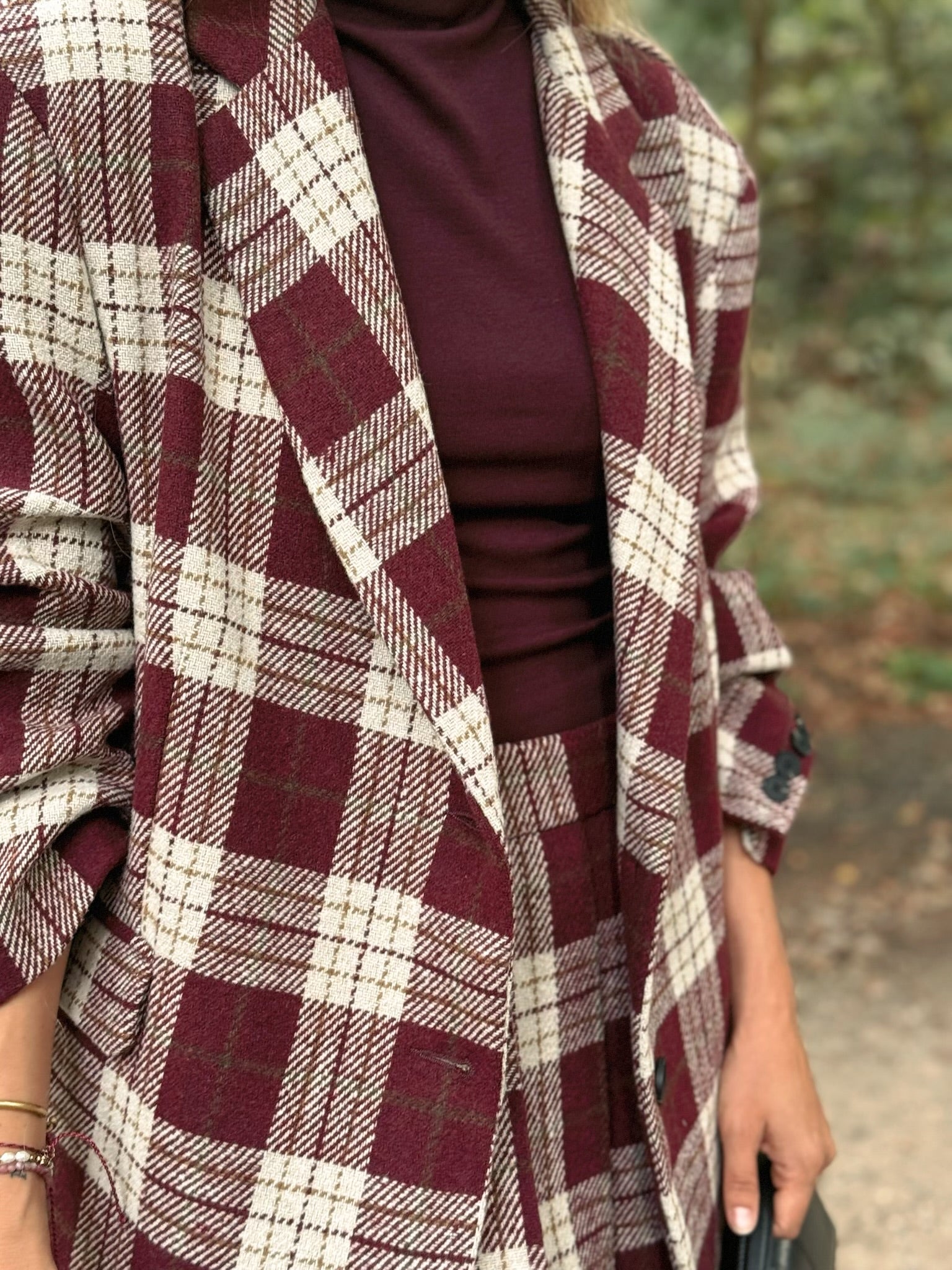 Het rijke bordeaux en de klassieke ruiten maken deze blazer tot een tijdloze toevoeging aan je herfstgarderobe. Of je nu geniet van een gezellige wandeling door de bladeren of een zakelijke afspraak hebt, deze blazer biedt zowel stijl als comfort.