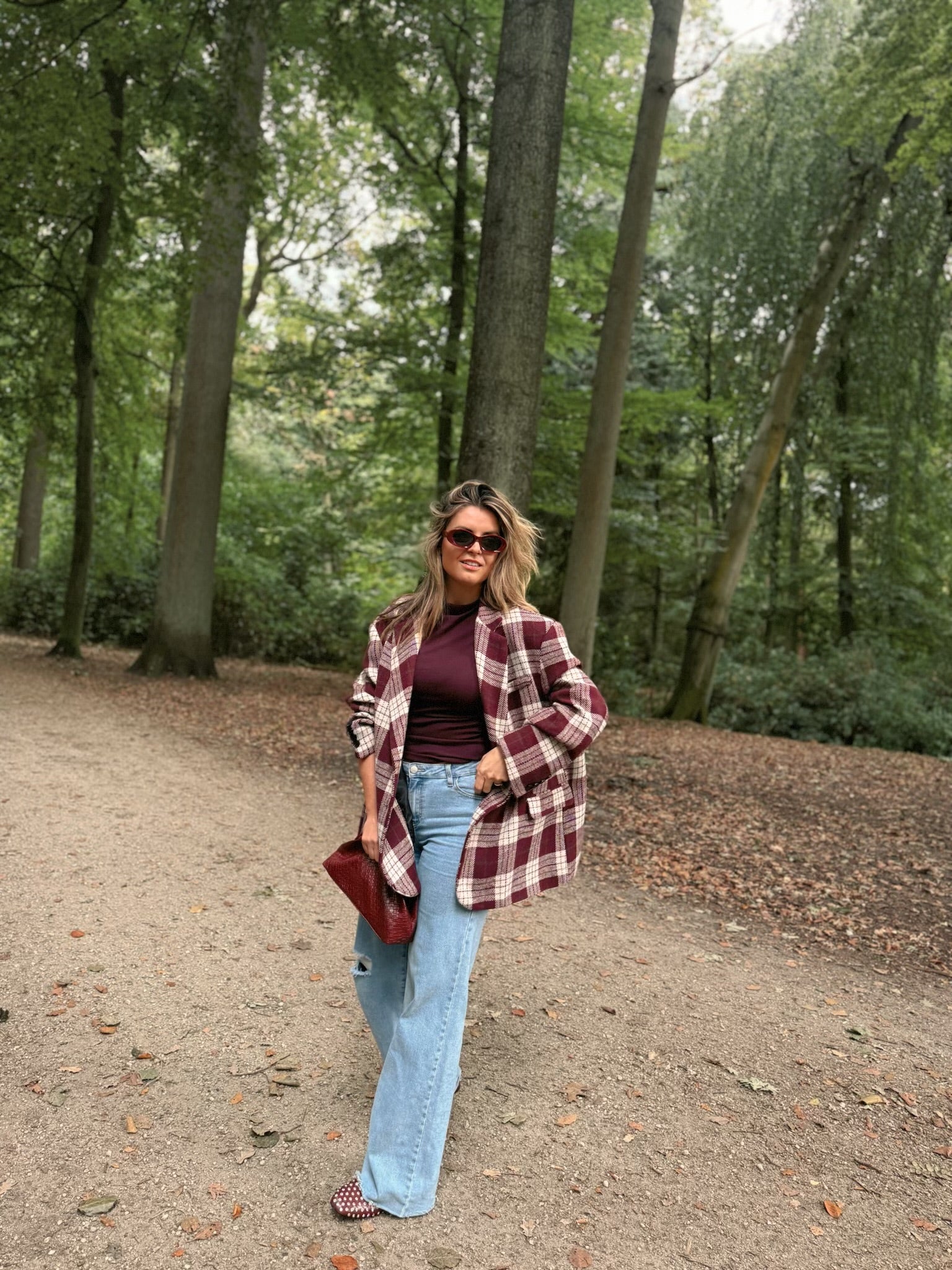 Met de bordeaux blazer met ruitpatroon haal je niet alleen de herfst in je kast, maar ook de perfecte balans tussen casual en chique.