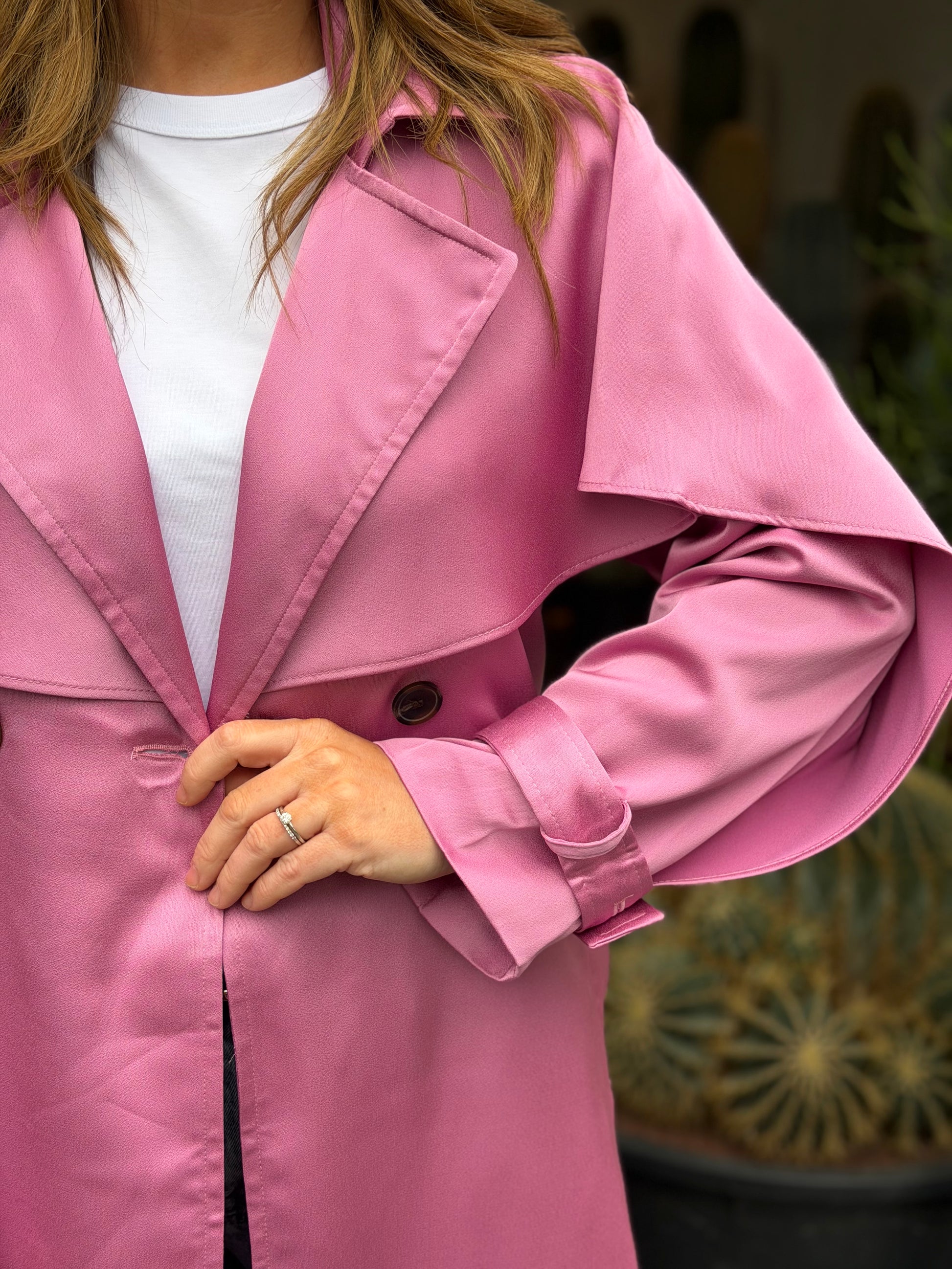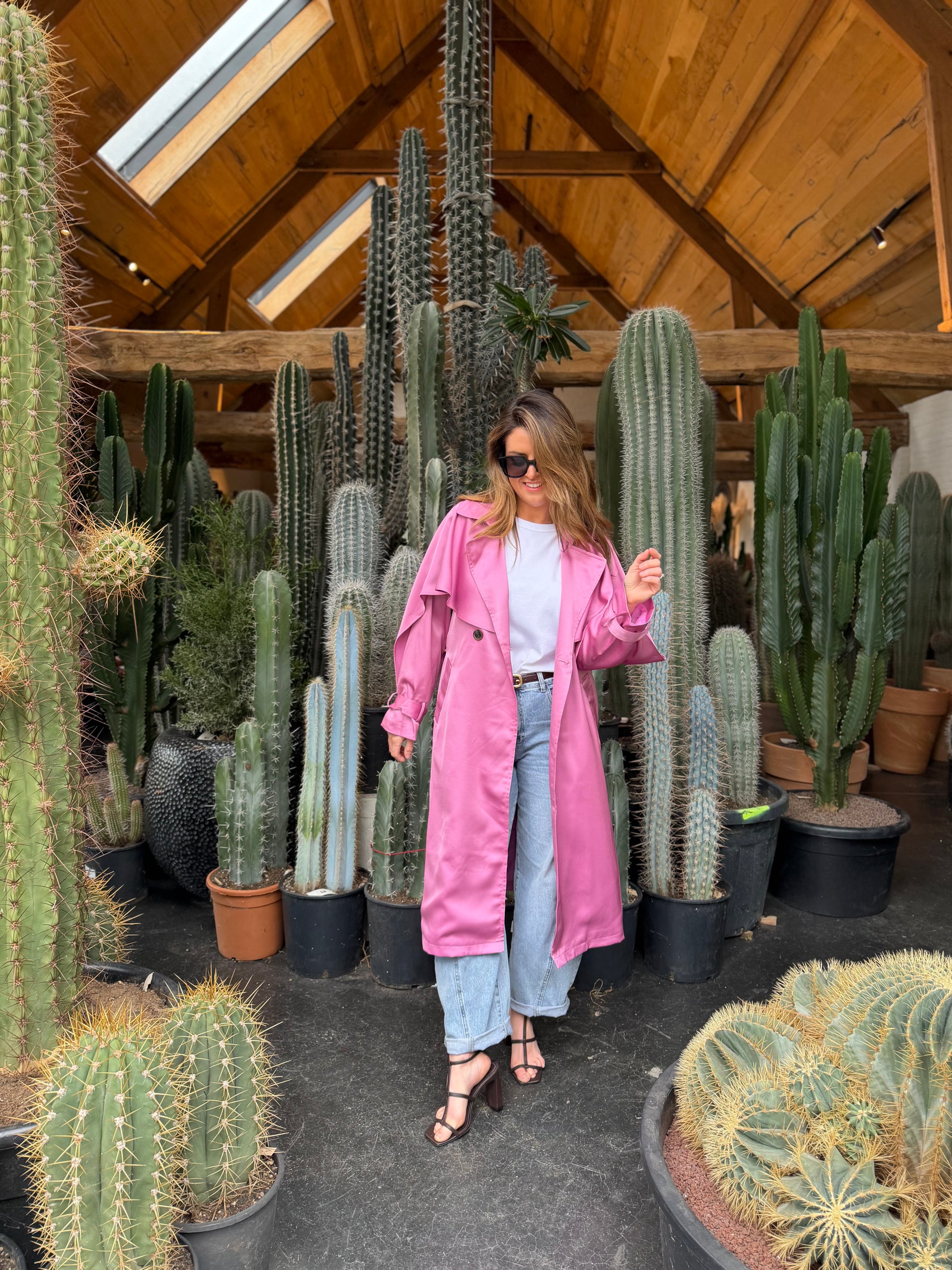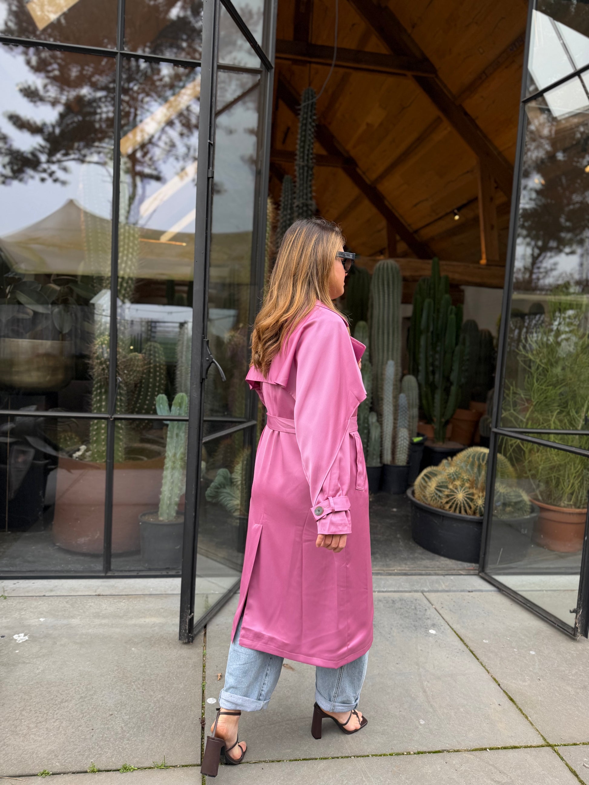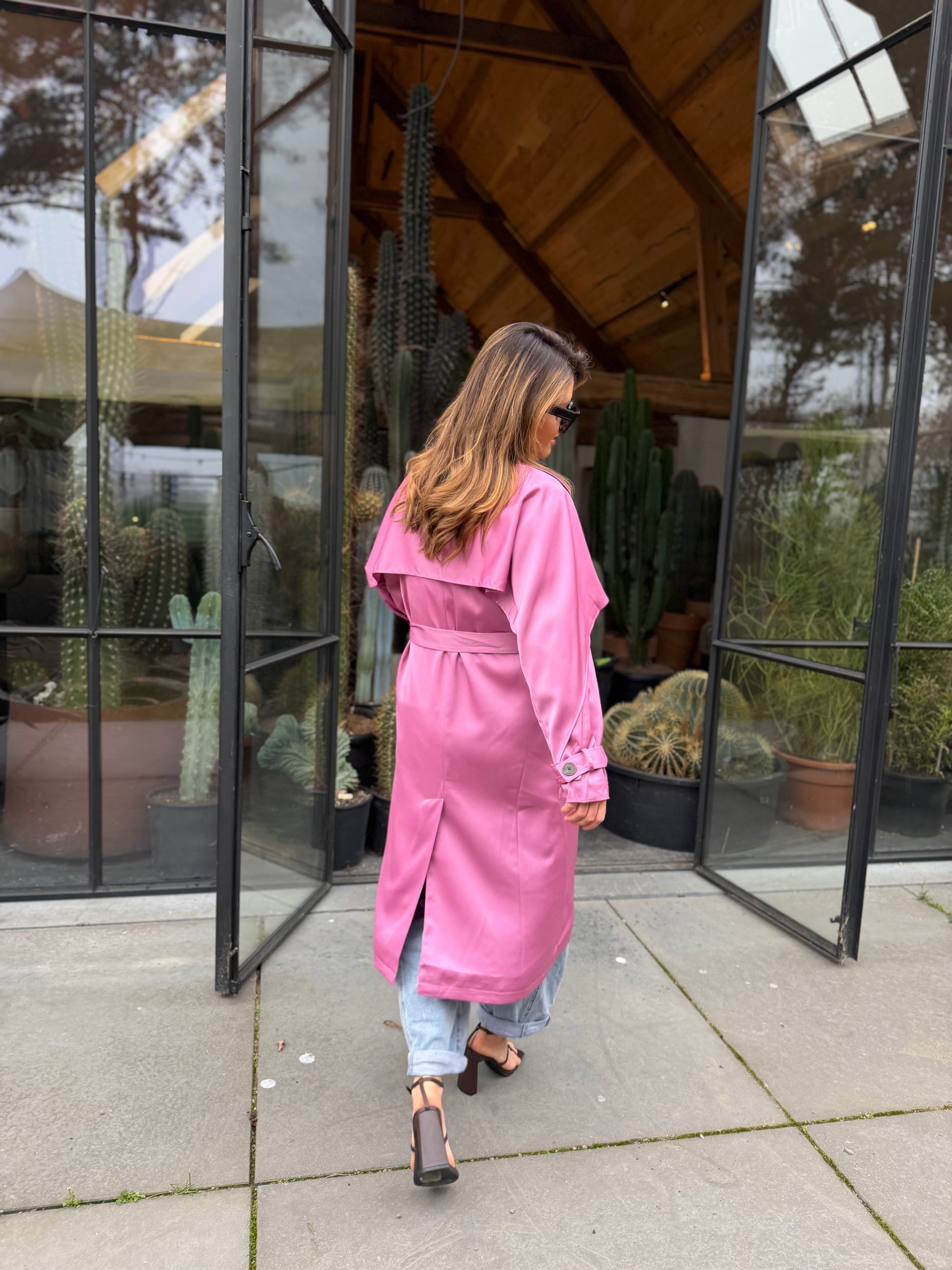 Elegante trenchcoat in een prachtige roze satijnen stof. De subtiele glans geeft de jas een luxe en vrouwelijke uitstraling, terwijl het tijdloze trenchmodel zorgt voor een stijlvolle look. Perfect om elke outfit een verfijnde en modieuze touch te geven.